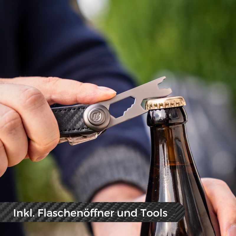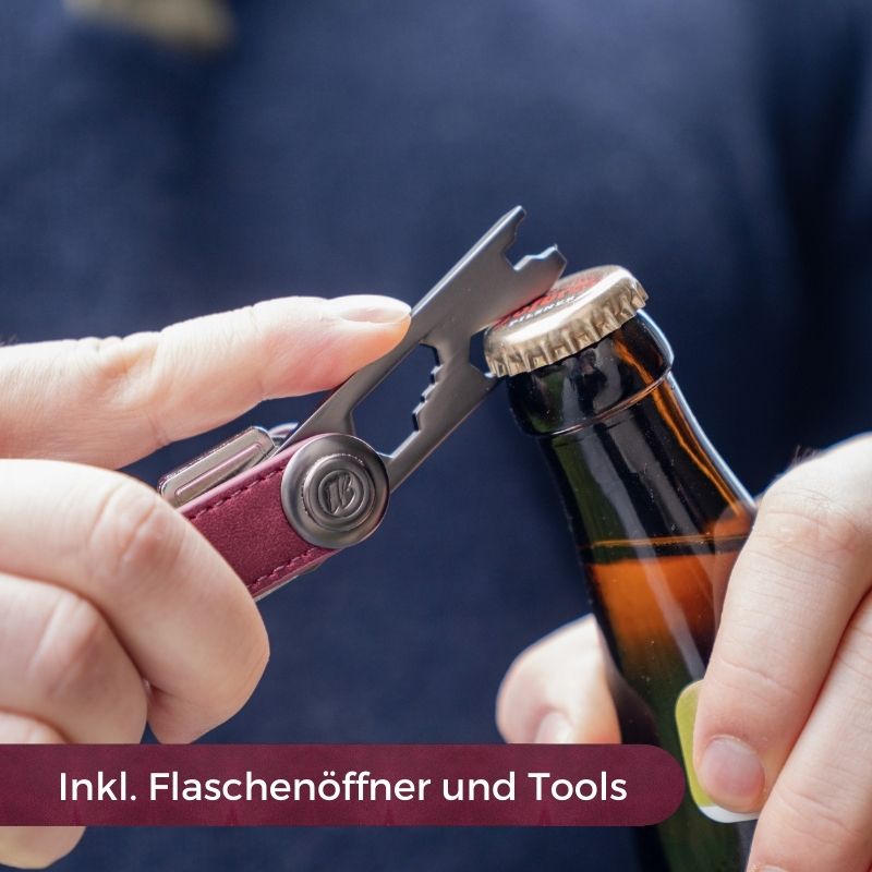 The smart wallet features RFID protection, safeguarding your cards from unauthorized scanning. This keeps your data secure. Thanks to our unique flip mechanism, cards can only be removed by deliberately pressing the switch. Otherwise, the cards remain secure and cannot fall out.