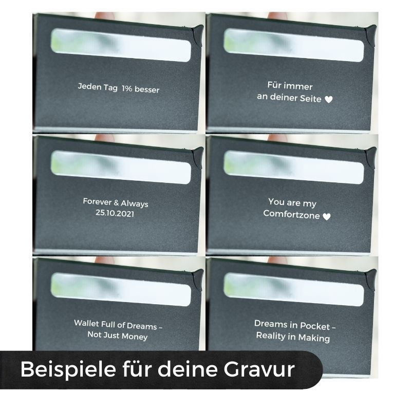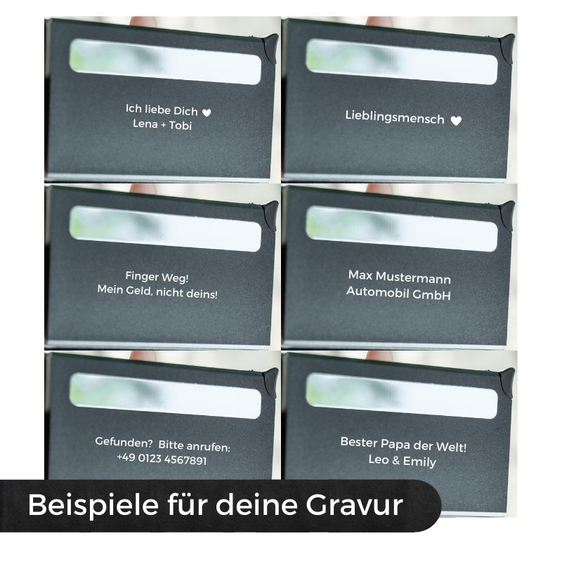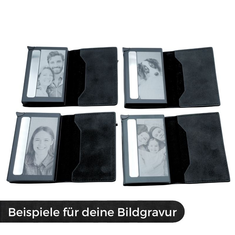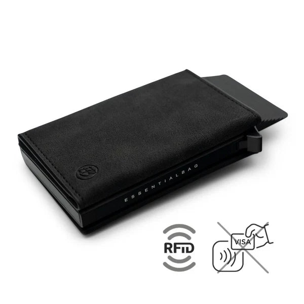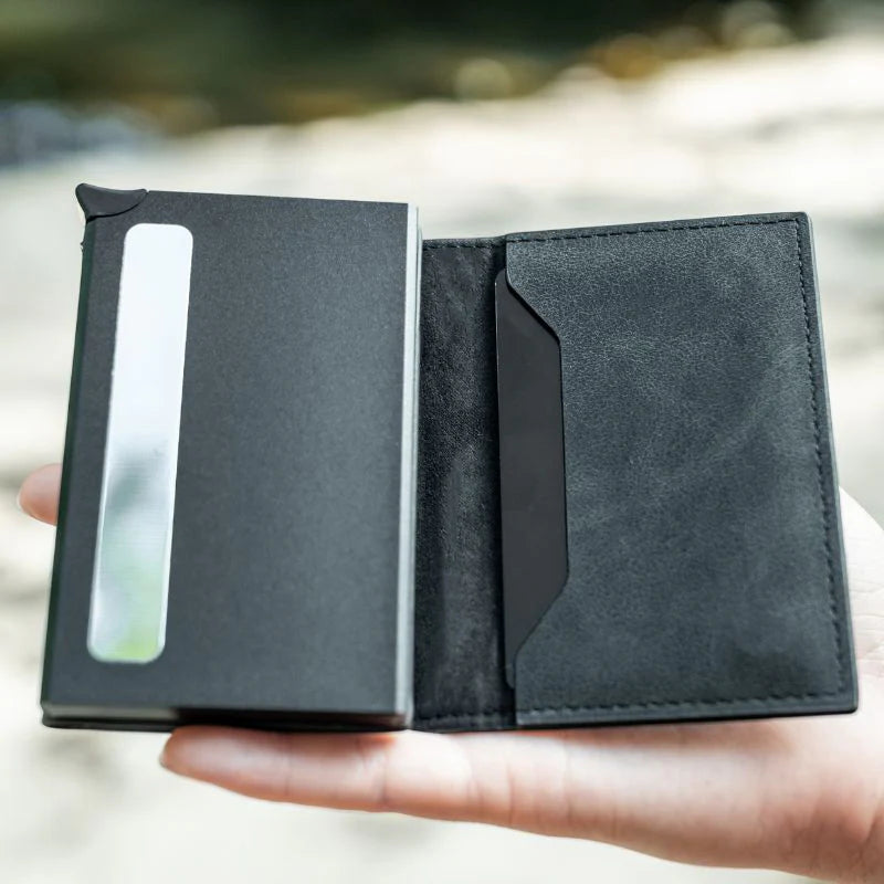 The smart wallet features RFID protection, safeguarding your cards from unauthorized scanning. This keeps your data secure. Thanks to our unique flip mechanism, cards can only be removed by deliberately pressing the switch. Otherwise, the cards remain secure and cannot fall out.